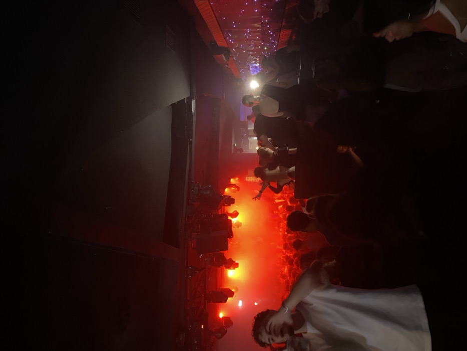 The image depicts a crowded nightclub or event venue in Kehl, Germany, characterized by dim lighting and vibrant stage illumination