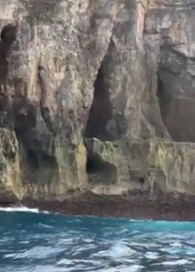 rocky cliff face rising from the ocean. The cliff is made of gray and brown stone, with some greenery on top and a few small caves. The ocean water is deep blue, with small waves crashing against the base of the cliff. A building can be seen on top of the cliff in the distance. The camera appears to be on a boat.