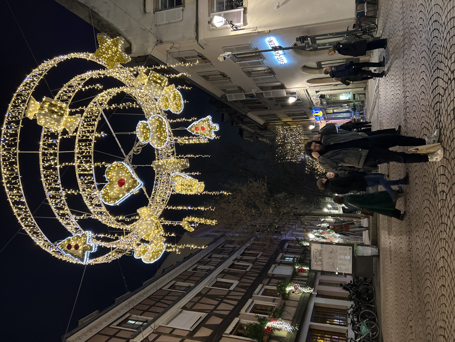 - "A nighttime street scene showcases a large, circular Christmas decoration adorned with twinkling lights" by FM-2ffbq1, licensed under CC BY 4.0