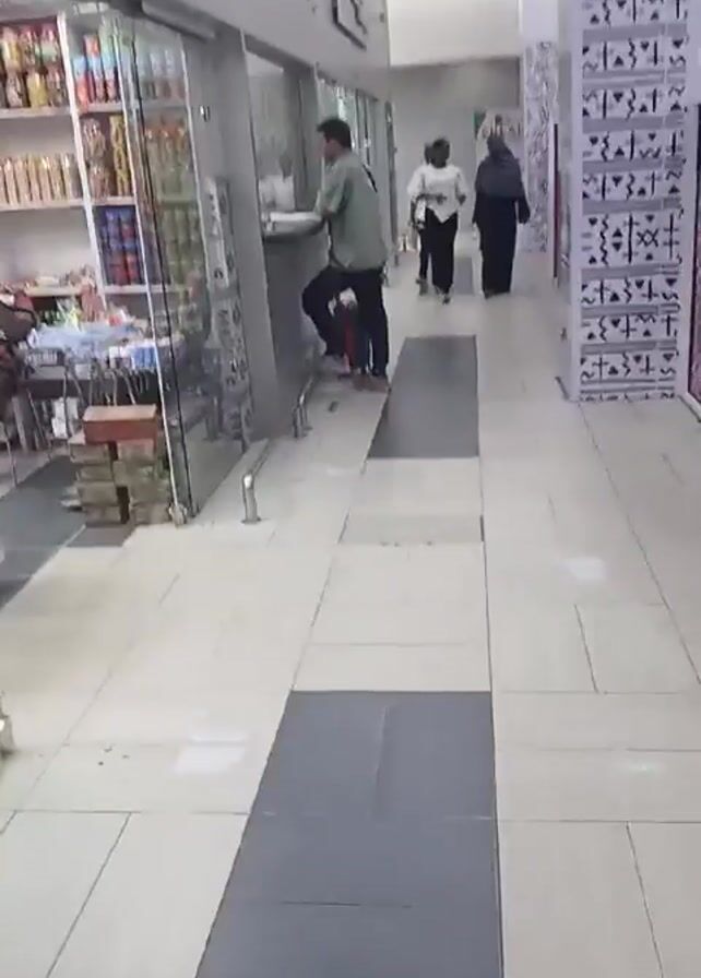 The camera is moving forward in an indoor corridor. Three people are walking in the same direction as the camera, two in white shirts and one wearing a black hijab. A fourth person, wearing a green shirt, is standing at a counter to the left. One side of the corridor is lined with glass-fronted stores, and the other side has decorative columns covered in black and white hieroglyphic-style designs. The floor is tiled with a mix of light and dark gray tiles.
