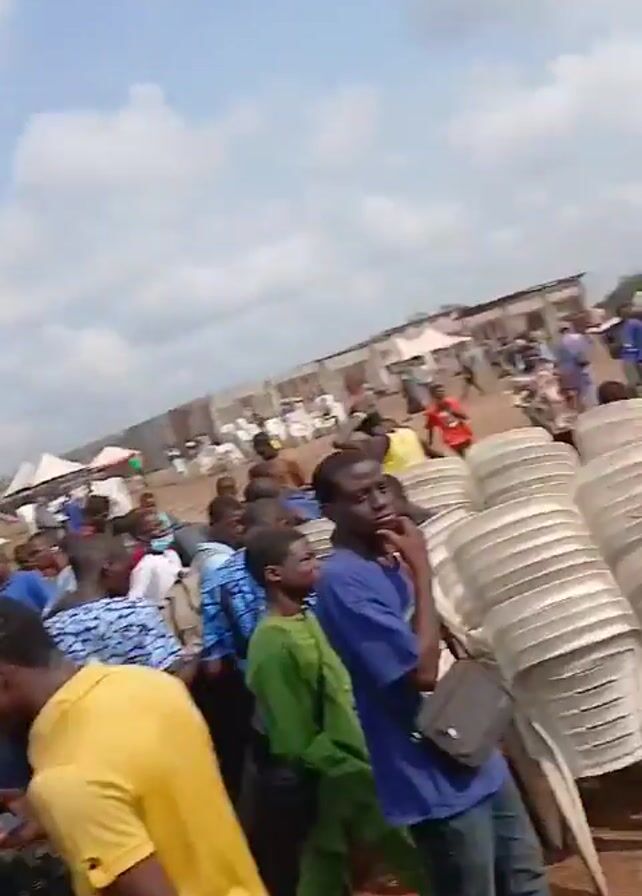 large gathering of people outdoors. Many are carrying bags. There are white tents set up in the background. The ground appears to be dirt or sand. The camera is moving and panning across the crowd. A young boy in a red shirt smiles at the camera. The sky is partly cloudy.