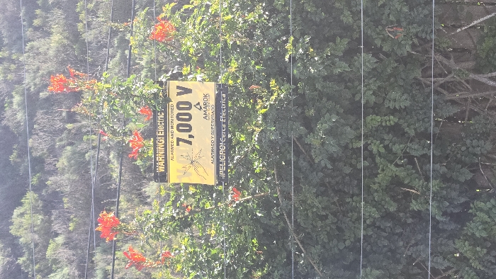 An electric fence, indicated by thin wires strung horizontally across foliage, is marked with a bright yellow warning sign