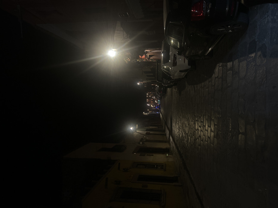 The image displays a dimly lit, narrow cobblestone street at night, situated within San Miguel de Allende, Mexico. The street surface is composed of dark, irregular cobblestones, reflecting light from overhead streetlamps. Traditional colonial-style buildings line both sides of the thoroughfare. The building on the immediate left exhibits a light-colored, possibly yellowish-beige facade with visible windows. Buildings on the right appear darker. Multiple streetlights illuminate the scene; one prominent, bright light source on the right side of the frame generates significant lens flare and illuminates parked vehicles. A line of at least five passenger vehicles, including a dark hatchback/SUV and a white sedan, are parked bumper-to-bumper along the right curb, their forms partially obscured by shadow and light. The street recedes into the distance, where additional ambient light sources are visible. No individuals or active vehicles are present in the scene.