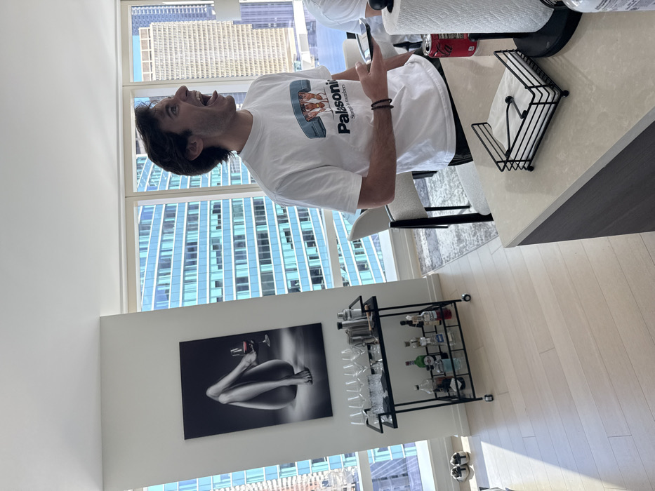 This image captures an interior scene within a modern residential unit located in Downtown Boston, United States. A male subject is positioned right-of-center, with dark hair and wearing a white t-shirt featuring a "Palasonic" graphic. His mouth is wide open and tongue extended, indicative of an exclamation or laughter, while he holds a black smartphone horizontally in his left hand. A dark bracelet is present on his left wrist. A second individual is partially visible on the far right, also wearing a white shirt. To the left, a black, two-tiered bar cart on wheels is situated against a white wall. Its upper tier holds multiple empty stemmed wine glasses, a cocktail shaker, and bar tools. The lower tier contains various liquor bottles. Above the bar cart, a large, black-and-white framed print is mounted, depicting a person's bare legs with a glass of red wine. The foreground right displays a light-colored kitchen countertop, on which a black metal napkin holder with white napkins, a paper towel dispenser holding white paper towels, a red Coca-Cola can, and a white bottle are arranged. The floor throughout the visible area is light-colored hardwood. A grey patterned rug is partially visible beneath two modern dining chairs in the midground. Expansive floor-to-ceiling windows dominate the background, offering a high-altitude view of the Boston cityscape. A prominent blue-glass skyscraper, identifiable as the Millennium Tower, is centrally visible, alongside a lighter-toned skyscraper further to the right. The space is brightly illuminated by natural light, casting distinct shadows on the floor. Two light-colored shoes rest on the floor against the far left wall.