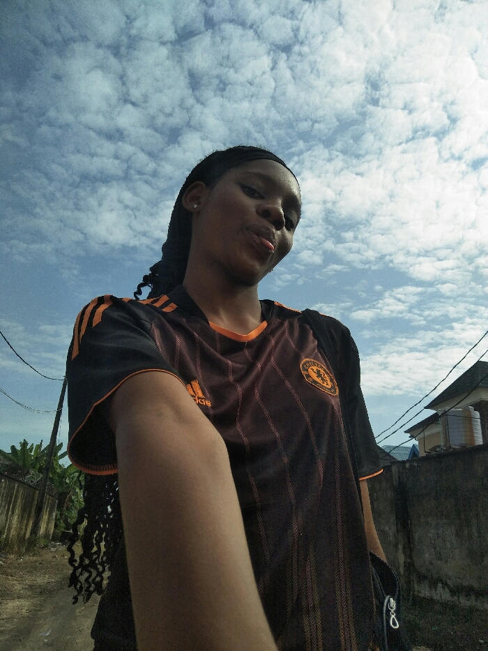 This image captures a young female individual taking a selfie outdoors in Iranla, Nigeria. The subject, characterized by dark skin and long, dark braided hair cascading over her left shoulder, wears a black and orange striped short-sleeved athletic shirt. The shirt displays an "Adidas" logo on the right chest and a "Chelsea Football Club" crest on the left. A small silver stud earring is visible in her left ear. She faces the camera directly, her head slightly tilted, with her tongue partially extended in a playful gesture. Her right arm is extended forward, indicating she is holding the camera. The background features a partly cloudy sky filled with scattered cumulus clouds. Below the sky, an unpaved pathway runs along the left side of the frame, bordered by green foliage and a utility pole supporting overhead electrical or communication wires. A concrete wall extends across the mid-ground, behind which a building with a dark roof, light-colored walls, and a white water tank on its roof is partially visible on the right.