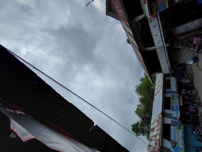 A street scene under a cloudy sky features buildings with aged corrugated metal roofs. A dark awning occupies the lower-left. The buildings line both sides of a narrow street, populated with parked motorcycles and possibly people. Green trees are visible behind one of the structures. Power lines stretch across the sky between the buildings, adding to the urban feel. The camera is angled upwards, emphasizing the height of the structures and the expansive sky.