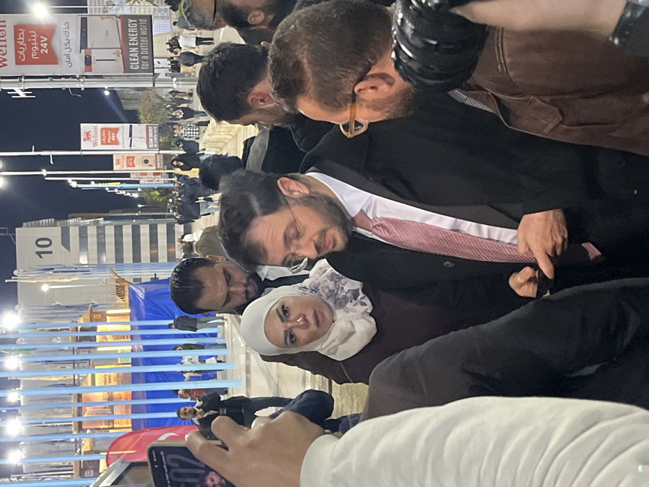 A group of people are gathered, some looking towards the camera and others with their heads bowed. A woman in a headscarf stands out in the foreground. A man in a suit and tie appears to be looking down. The background includes light poles with commercial advertisements for "Welion" and "Clean Energy". There is a building with a large "10" visible. Some people are holding phones, possibly taking pictures. The atmosphere seems to be either somber or intently focused.