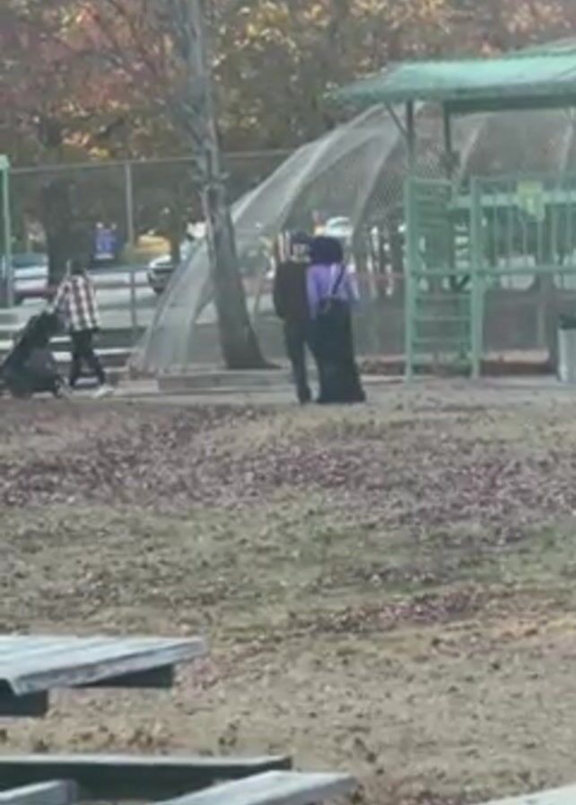 The camera is positioned with a long-range view of an outdoor park or recreation area on an overcast day. The foreground has empty picnic tables and a low concrete wall, obscured with a few fallen leaves. A large area of fallen leaves covers the ground leading to a cement pathway. A person in a red and black plaid shirt walks away to the left side of the frame carrying what looks like a black, folded-up tent. Standing on the cement pathway is a person in a brown jacket and blue hat talking to another person in a purple shirt and long black skirt. Behind the second person is a green metal structure, likely for sports activities. In the background are trees with reddish leaves and some parked cars.