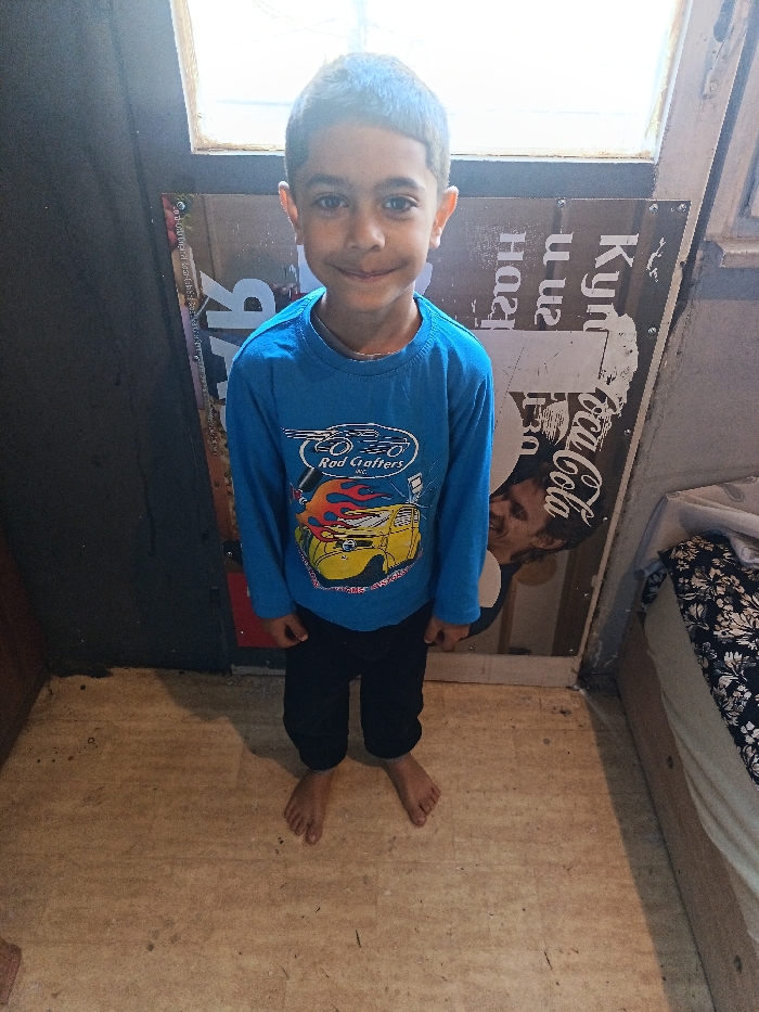 A young boy stands barefoot on a linoleum floor, wearing a blue long-sleeved shirt with a race car design and black pants. He is smiling and looking directly at the camera. Behind him are a wall with a Coca-Cola advertisement sign and a window with a light source coming from above. To his right is a bed with a patterned bedspread. To his left is a dark-colored wall. The overall lighting is somewhat dim.