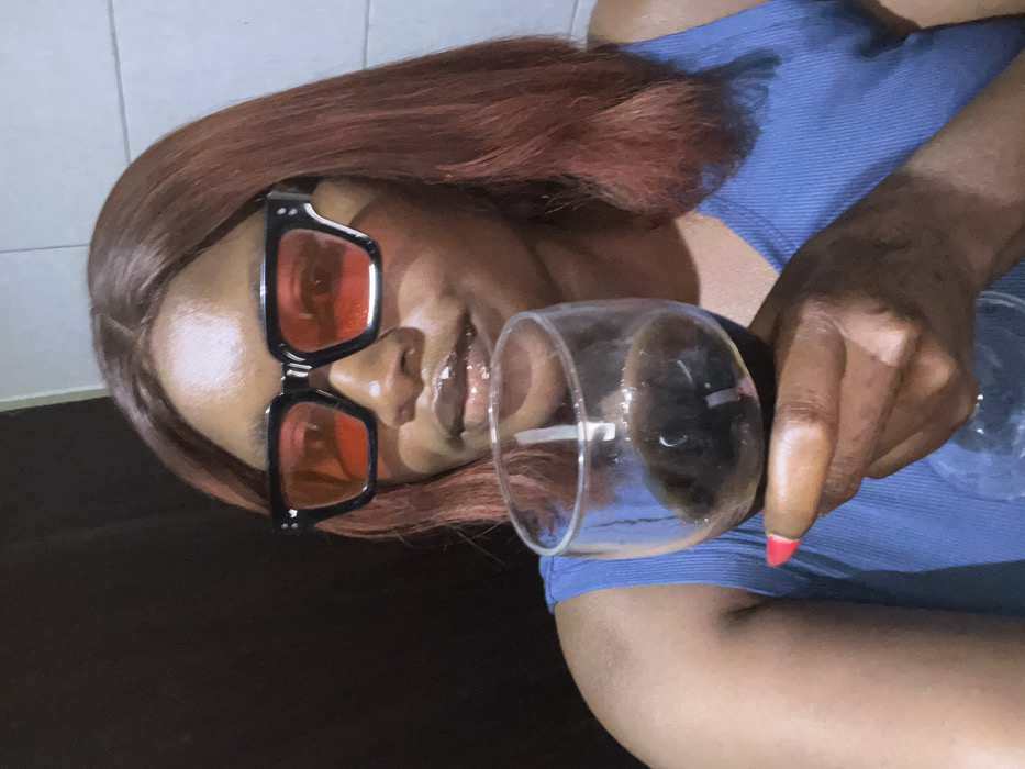 A woman with red-tinted sunglasses and reddish-brown hair holds a glass with liquid inside. She wears a blue top. Her nails are painted red. The background consists of what appears to be a tiled wall on the top-left and a dark-colored flat surface towards the bottom. The image is oriented sideways.