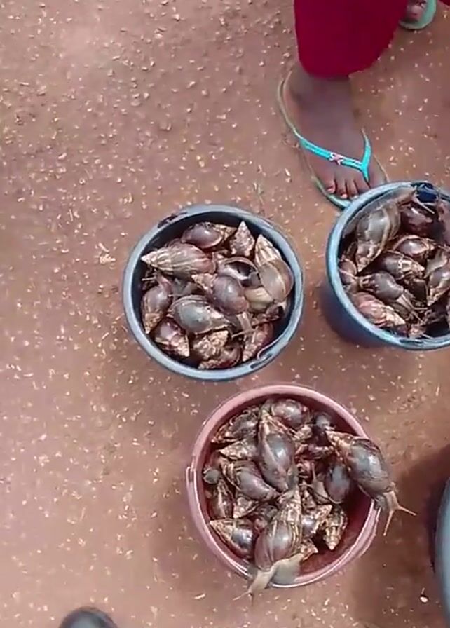 close-up view of four buckets filled with snails on a red, pebbled surface. Two people are visible, one wearing red pants and blue flip-flops and the other wearing black shoes. A hand reaches into the bucket on the right, moving the snails around. The buckets are various colors including blue, pink, black and yellow. The snails are brown and many are extending out of their shells. The background is blurry.