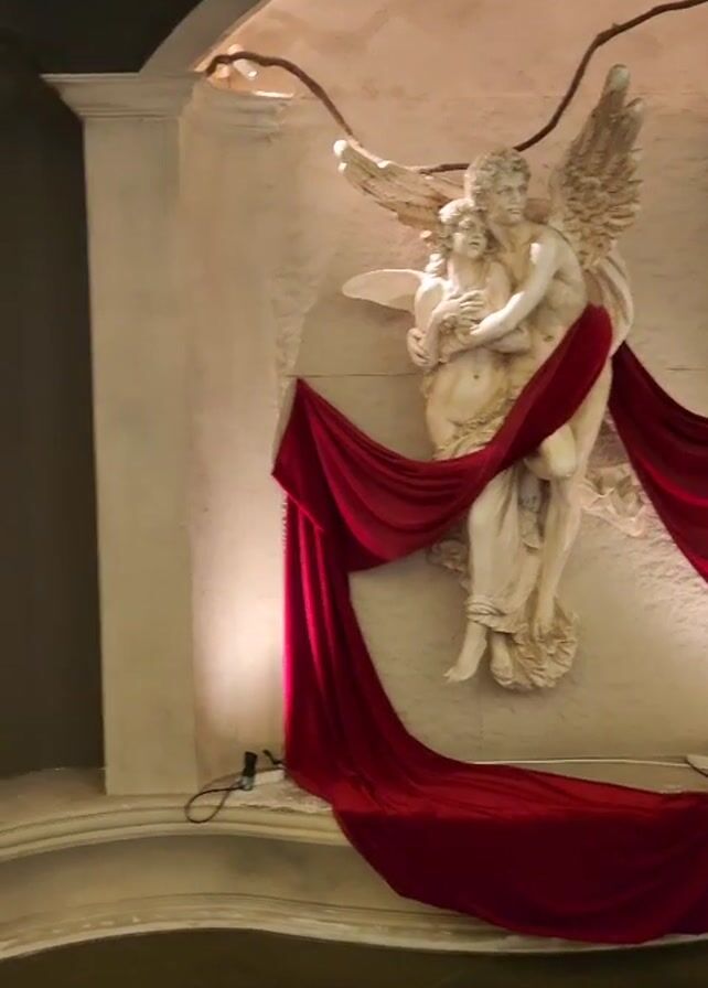 building decorated for Christmas. The first shot is of a white statue of two figures with wings embracing, draped in red fabric. The camera pans to show a white statue of a draped woman holding flowers, also draped in red fabric. The camera then shows an entrance decorated with a garland of lights and ornaments. The final shot is of a Christmas tree decorated with red, gold, and silver ornaments.