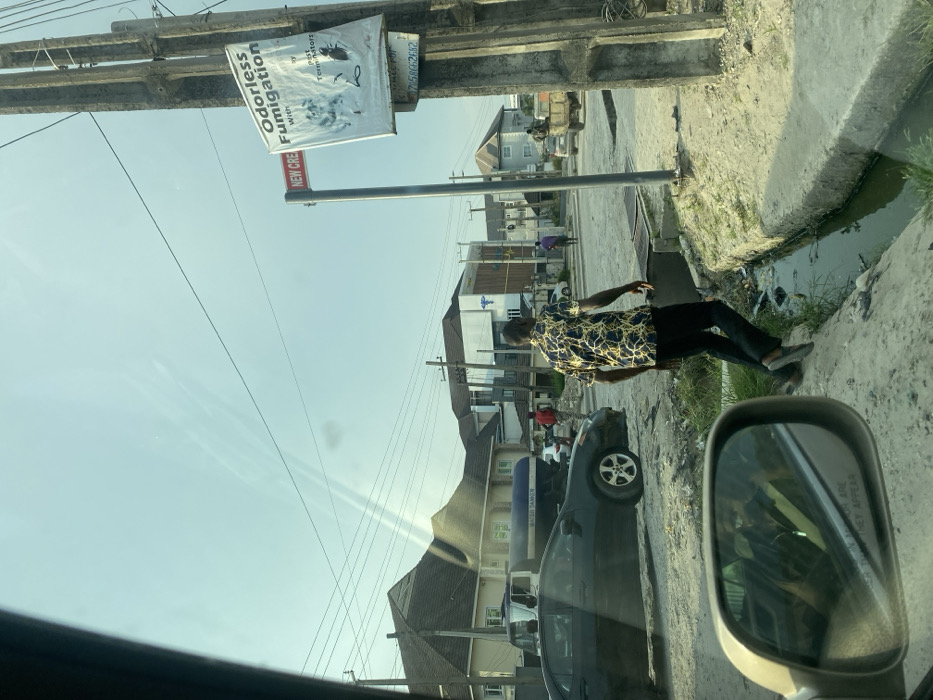 The image depicts a street scene in Ilado, Nigeria, viewed from the interior of a vehicle