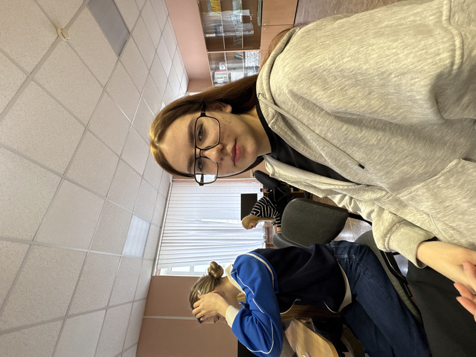 The image depicts an indoor scene, likely a classroom or study area within an educational institution. Three young females are present. In the foreground, a female with medium-length brown hair, wearing black-framed glasses, a black t-shirt, and a light grey hooded zipper sweatshirt, is positioned towards the camera with a neutral expression. Her right forearm is visible, and her left hand is partially visible, appearing to be holding or touching another hand, which is mostly out of frame. To the immediate left of the foreground subject, a second female with blonde hair, styled in a bun, is seated at a light-colored wooden desk. She is wearing a blue and dark blue jacket with white trim and blue jeans. Her right hand is raised near her head, and her gaze is directed away from the camera. Further in the background to the left, a third female with blonde hair, wearing a black and white striped long-sleeved shirt, is seated at a dark-colored desk, facing away from the camera. The room features pale peach-colored walls and a white acoustic tile drop ceiling with rectangular fluorescent light fixtures. A round, white smoke detector is visible on the ceiling. Large windows with white vertical blinds are present on the far wall, providing natural light. On the right side of the room, a light-colored wooden shelving unit with glass doors displays various items, including books and white boxes. Dark grey office-style chairs are visible at the desks. The floor appears to be a wooden or laminate surface. Based on the visual evidence, the specific location within the city of Saint Petersburg, Russia, cannot be determined.