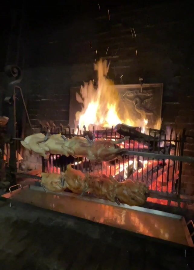 large brick fireplace with a roaring fire inside. Two spits are mounted in front of the fire, each holding several chickens that are rotating as they cook. The chickens on the lower spit appear to be more cooked than those on the upper spit. Sparks are visible rising from the fire. An elaborate metalwork plaque hangs above the fire. An old-fashioned metal contraption is visible on the left side of the fireplace. The scene is dimly lit.