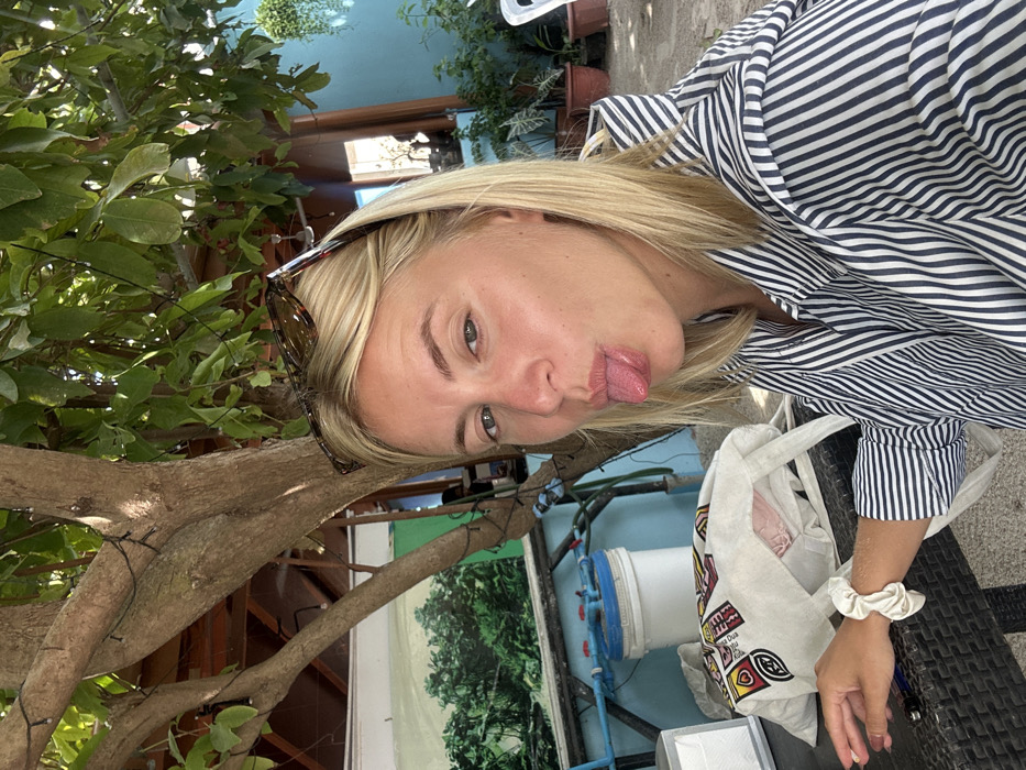 A blonde woman wearing a striped shirt sticks her tongue out at the camera. Sunglasses rest on her head. A tree and foliage are on the left, and a bag and a scrunchie on her wrist are on the right. In the background, there's a blue wall with plants, a white bucket, and piping. The photo appears to be taken outdoors.