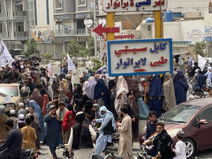 The image displays a densely populated urban street scene in the city of Arghandab, Afghanistan, under daylight conditions. Several hundred individuals, comprising adult males, females, and numerous children, occupy the paved roadway and adjacent sidewalks. A significant number of women wear burqas, predominantly in dark blue, light brown, or light blue hues, while men are dressed in traditional Afghan attire. Vehicles present include multiple motorcycles, some stationary, others navigating slowly through the crowd, and a maroon sedan partially visible in the lower right foreground. A light-colored SUV or truck on the far left is heavily laden with people, including individuals positioned on its roof. Several white flags are visible within the crowd; some are plain white, while others are emblazoned with black Arabic script characteristic of the Islamic Emirate of Afghanistan, held aloft on poles. A prominent blue and white rectangular sign with an orange border is centrally located, displaying "کابل سیتی طبی لابراتوار" (Kabul City Medical Laboratory) in Arabic script, with an arrow pointing right. Various commercial signs adorn the multi-story buildings that line the street in the background. The overall scene indicates a large public gathering or procession.
