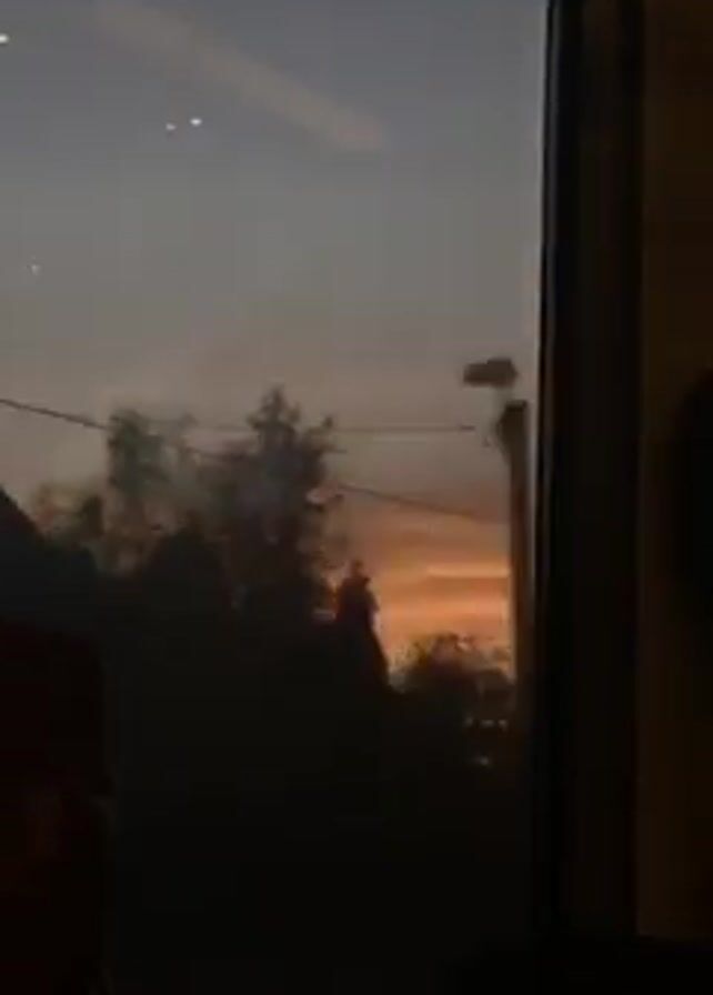 From the vantage point of a train passenger, the camera peers through a window at dusk, with a skyline painted in shades of orange and violet. In the foreground, glimpses of the train seat's headrest and a cable indicate an interior setting. The window's reflection reveals interior lights. Across the tracks, a silhouetted house is briefly visible, followed by trees against the fiery horizon.