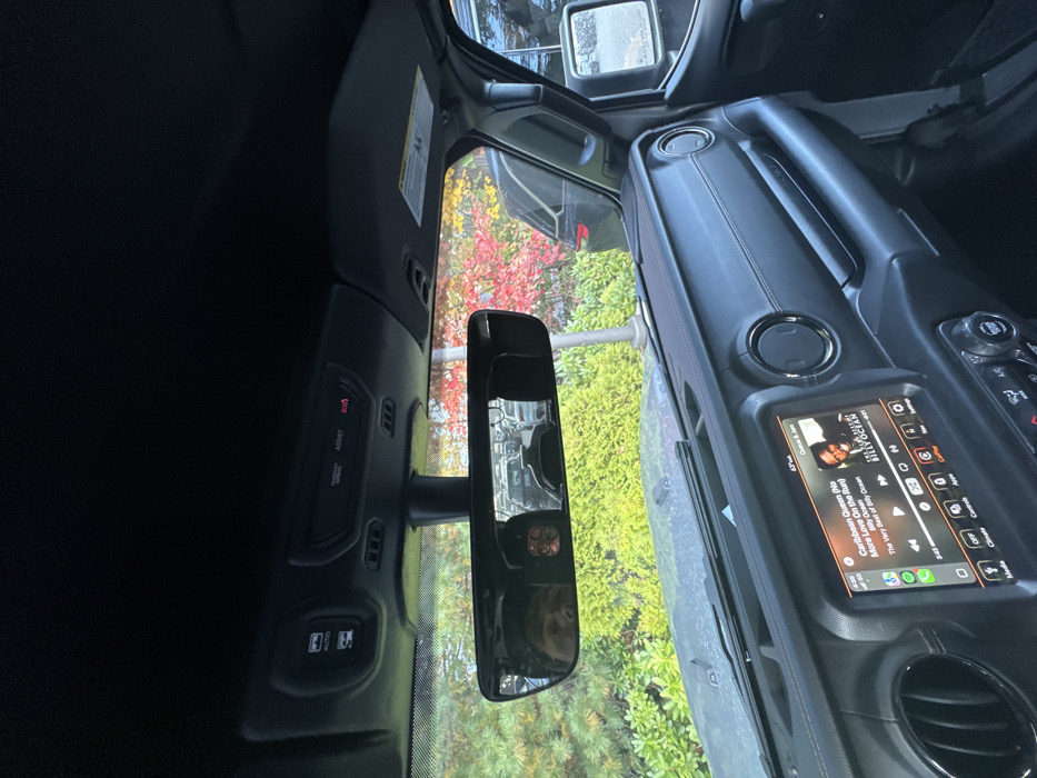 The image depicts the interior of a dark-colored vehicle, possibly a Jeep, looking forward through the windshield