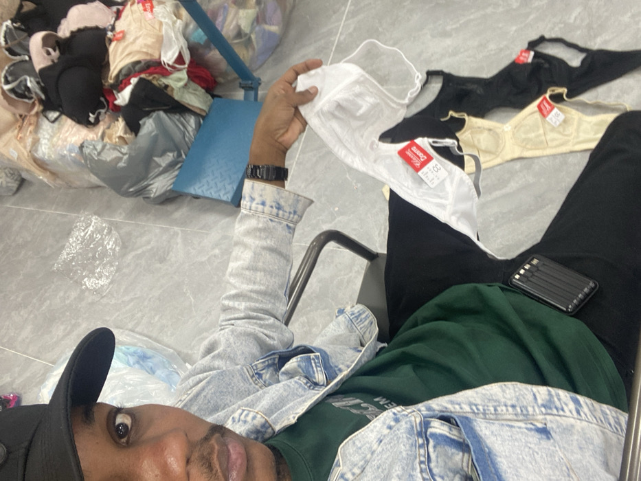An adult male is depicted in a selfie, taken indoors within Baiyun District, China. He is wearing a black baseball cap, a light blue denim jacket, and a dark green t-shirt. A black wristwatch is on his left wrist. He is seated on a black-framed chair, with dark pants partially visible. A black rectangular object, possibly a power bank, rests on his lap. He holds a white bra with a red "Classic Danson 80 CC" tag in his left hand. On the light grey tiled floor near his legs, two additional bras (one beige, one black), each with similar red tags, are visible. The background features a large, disorganized pile of assorted clothing, predominantly brassieres and undergarments of various colors (black, beige, pink, red), some contained in clear plastic bags. A grey refuse bag and a small light blue object are also present within the clothing pile. A crumpled clear plastic sheet lies on the tiled floor to the left of the clothing mass. The environment suggests a commercial storage or retail setting.
