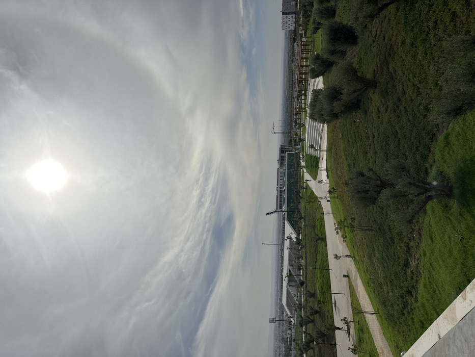 The image presents an elevated panoramic view of a modern public park and the Grande Stade de Fès in Fez, Morocco. The sky is largely covered by thin, wispy cirrus clouds, with a bright sun positioned high, causing a noticeable lens flare and a faint solar halo. The foreground and mid-ground consist of undulating green parkland, densely covered with short-cut grass and interspersed with numerous small, gnarled olive trees. Light-colored paved pathways wind through these areas, flanked by contemporary lampposts. On the right, a multi-tiered white stone amphitheater-style seating arrangement is visible, adjacent to a wooden pergola structure. Four individuals are present, walking independently along the paved paths; one is in the far-left mid-ground, another near the amphitheater, and two others further in the distance. Dominating the mid-ground on the left is the Grande Stade de Fès, a large stadium with a light-grey roof structure over its stands and a dark facade on its main building. Multiple tall floodlight towers are positioned around the stadium. Beyond the park, the urban landscape of Fez stretches into the hazy distance, characterized by low-rise buildings and at least two construction cranes indicating ongoing development. A distinct white multi-story building is visible in the far-right mid-ground.