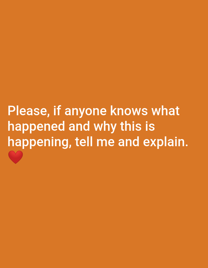 An image displays white text against an orange background. The text is a plea for information and understanding, reading, "Please, if anyone knows what happened and why this is happening, tell me and explain." A small, red heart emoji punctuates the end of the message. The simplicity of the image focuses attention on the urgency and vulnerability conveyed by the text.