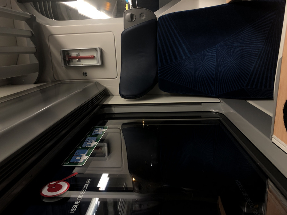 The scene captures an interior view, possibly of a train compartment. A blue patterned seat is visible next to a sleek, dark headrest. A silver emergency handle is encased in a compartment on the wall. Below the seat, a dark, reflective surface is marked with emergency instructions in French and a red emergency mallet. The color palette is dominated by shades of gray, blue, and black, creating a modern and potentially confined atmosphere.