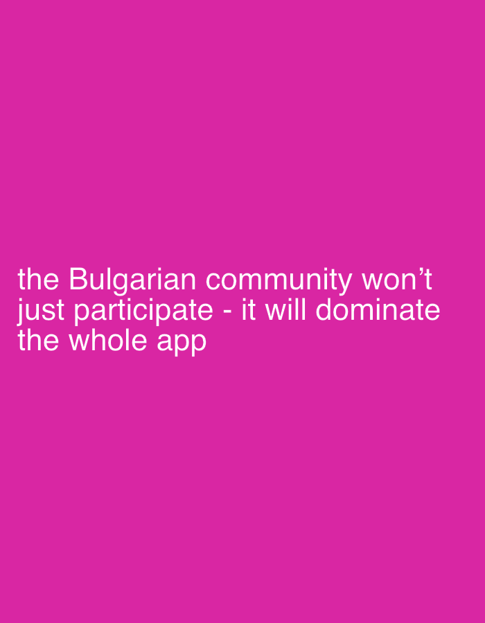 This image displays a solid magenta background. White, sans-serif text is centrally aligned in the lower half of the frame, reading: "the Bulgarian community won't just participate - it will dominate the whole app". There are no discernible people, subjects, objects, actions, interactions, or environmental features depicted. The image does not represent a physical location in the city of Sofia, Bulgaria, or any other geographical area; it is a graphic containing text on a plain background.