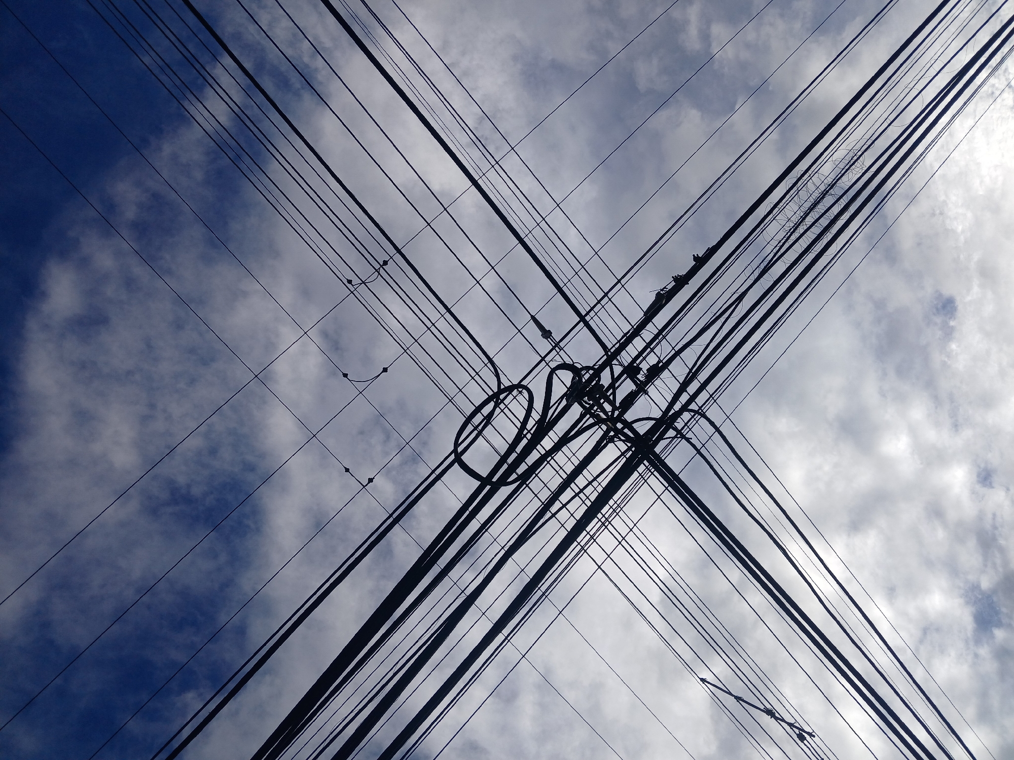 - "The image depicts a complex network of overhead utility wires, likely electrical and telecommunications lines, viewed from below against a partly cloudy sky in Guayana City, Venezuela" by FM-YF5w12, licensed under CC BY 4.0