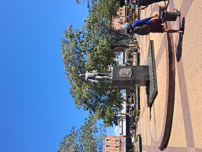 A statue stands tall in a sun-drenched park, framed by leafy trees against a clear blue sky. The monument, with an emblem on its base, casts a shadow onto the patterned pavement. A person in a blue shirt and dark shorts is nearby, seemingly about to discard something into a trash can. The scene is tranquil and bright, showcasing urban life amidst nature.