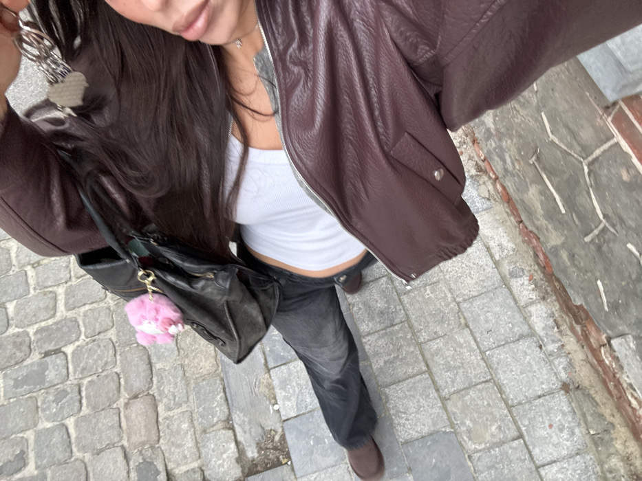 A high-angle, downward-looking photograph captures an individual on a paved street in Tielrode, Belgium. The person, identifiable by long, dark brown hair, wears a white ribbed tank top, dark grey denim jeans, and brown flat shoes. A dark reddish-brown jacket with a visible zipper is worn. A black leather shoulder bag is slung over the left shoulder, adorned with a bright pink, fluffy keychain. A silver necklace with a small pendant is visible on the chest. Near the right shoulder, a hand, largely out of frame, holds a set of keys with multiple silver keyrings. The ground surface consists of irregular grey cobblestones, with a lower edge of reddish-brown bricks and grey concrete/mortar visible along the right side of the frame.