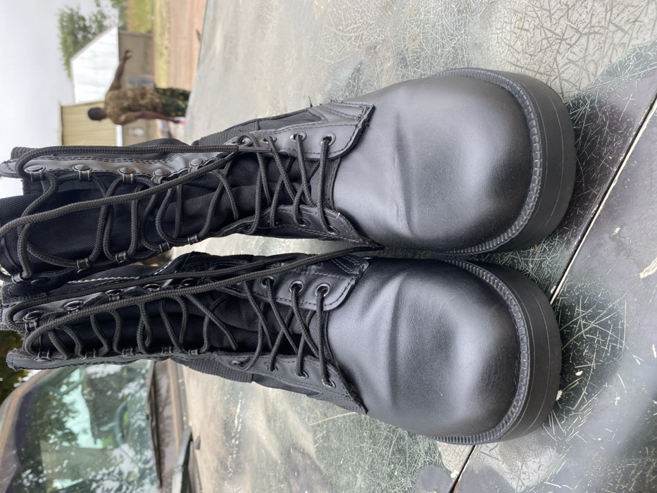 Two black leather military boots are centered on a dirty, mottled metal surface. The boots are laced and feature black nylon fabric sections along the shaft. A blurred figure in camouflage attire stands in the background near a building with a white roof. A car windshield and foliage are visible reflecting on the metal surface beneath the boots, suggesting they are resting on a vehicle. The sky is overcast.