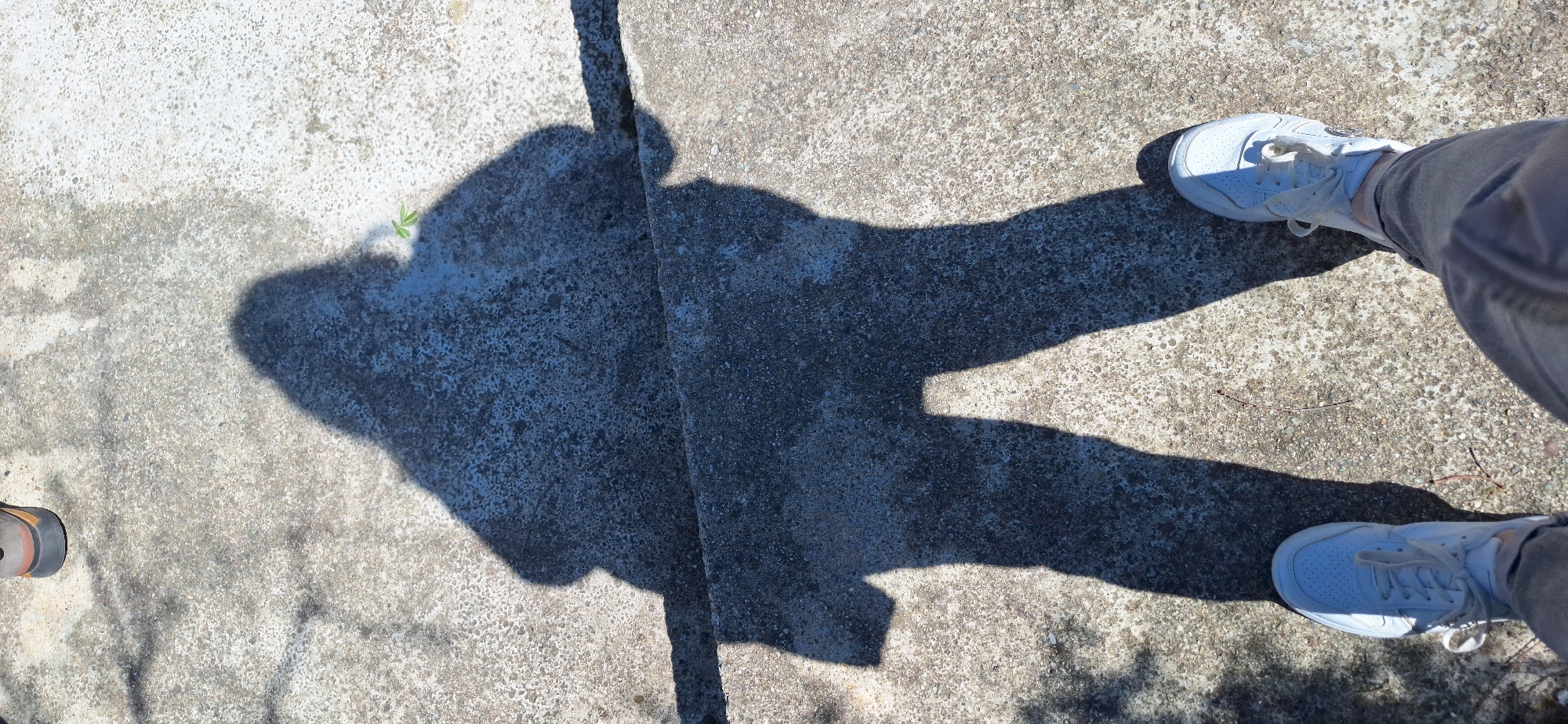 The image depicts a person's shadow cast on a concrete surface, likely a sidewalk or paved area