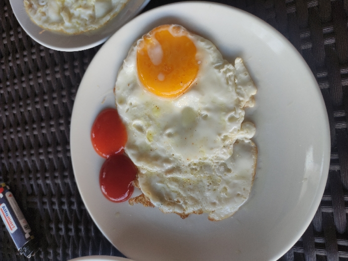 - "A plate of fried egg and ketchup is on a table with a brown woven texture" by FM-24rmI2, licensed under CC BY 4.0