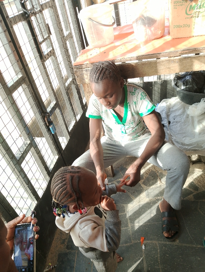 The image, taken in New Nyanya, Nigeria, depicts two children and a partial view of an adult's hand in an outdoor or semi-outdoor setting