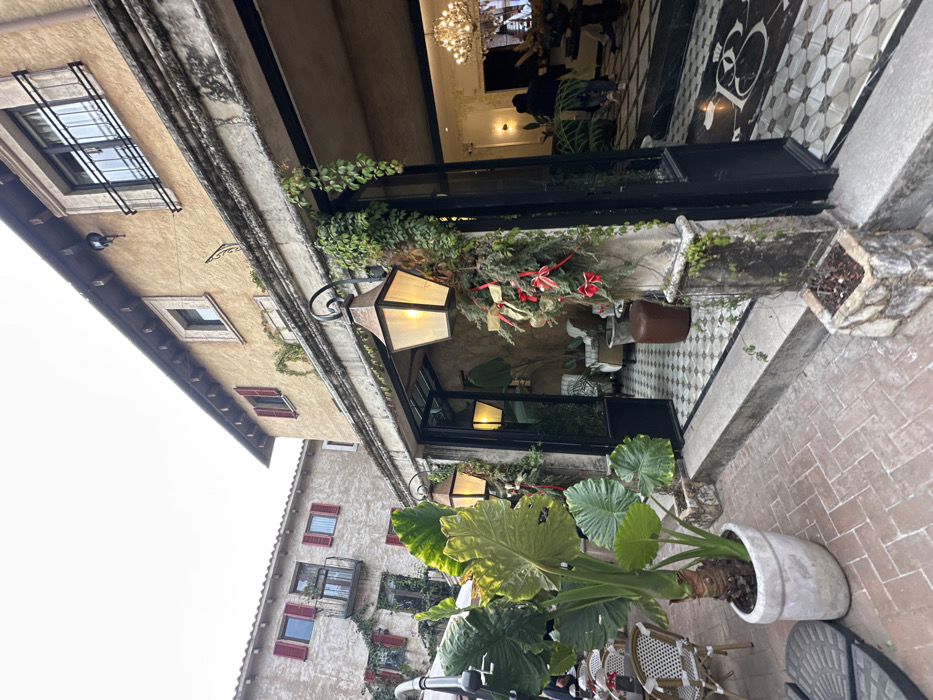 An outdoor setting with architectural details and greenery. A light-colored building with windows and a wrought-iron grate is seen on the left. A light fixture extends from the building, partially obscured by plants. Through an open doorway, a glimpse of a tiled floor and interior furnishings is visible. In the foreground, a large potted plant with broad leaves and a seating area suggest an outdoor cafe or restaurant space.