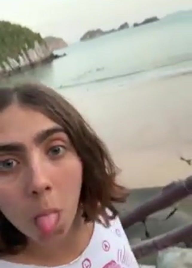 A young woman with fair skin, brown hair, and blue eyes is taking a selfie video. She has her tongue out at one point. She is wearing a white tank top with a pink design on it. Behind her is a beach with white sand, clear water, and a small island in the distance. The sky is overcast. There is a metal railing visible in the foreground.