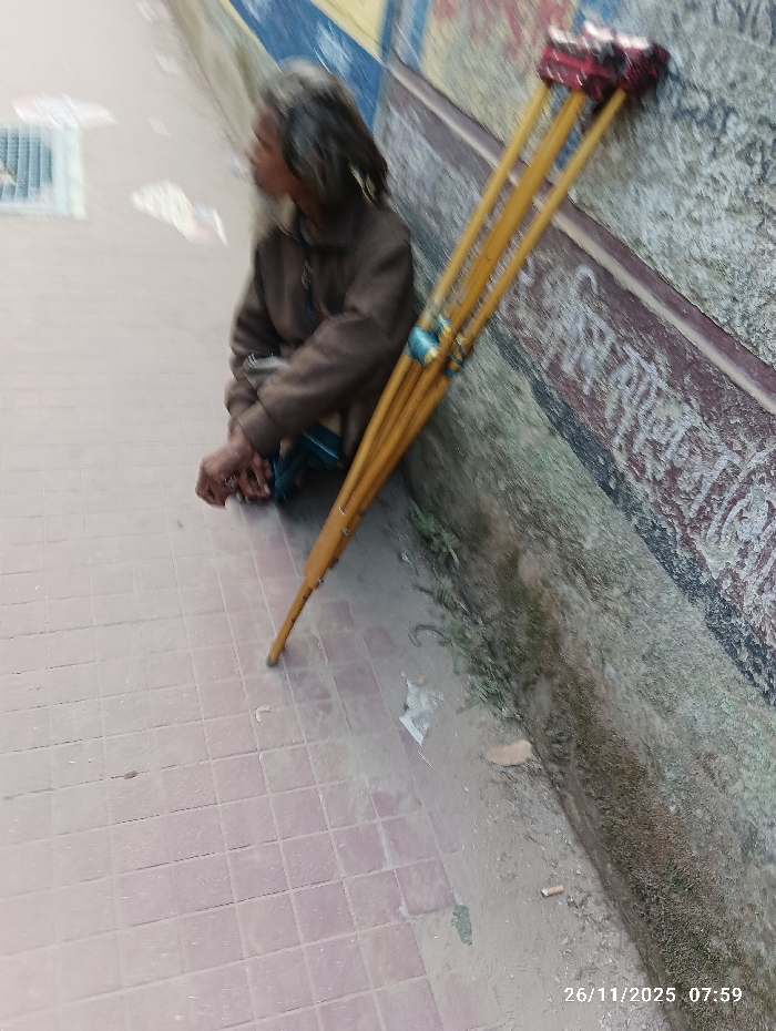 An elderly person with gray hair sits on a tiled sidewalk, leaning against a concrete wall. Their posture suggests a weary state. Crutches with red grips rest against the wall. The wall features faded paint and markings, indicating wear and age. The scene is captured with a slight blur, adding to the feeling of instability or hardship. A time and date stamp is visible in the bottom right corner.