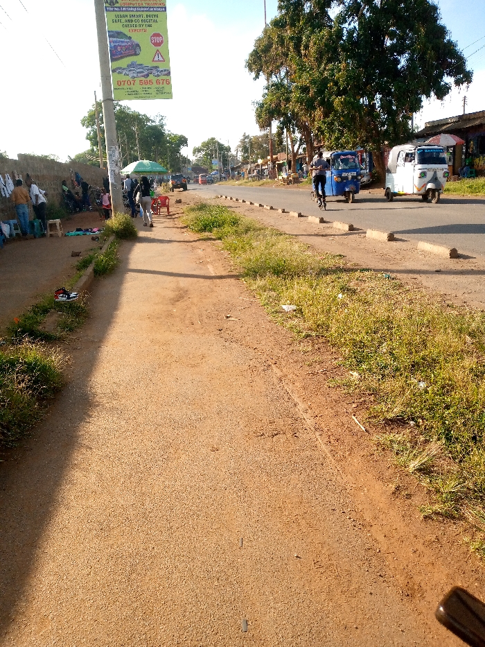 A street scene in a rural area shows a dirt sidewalk alongside a paved road