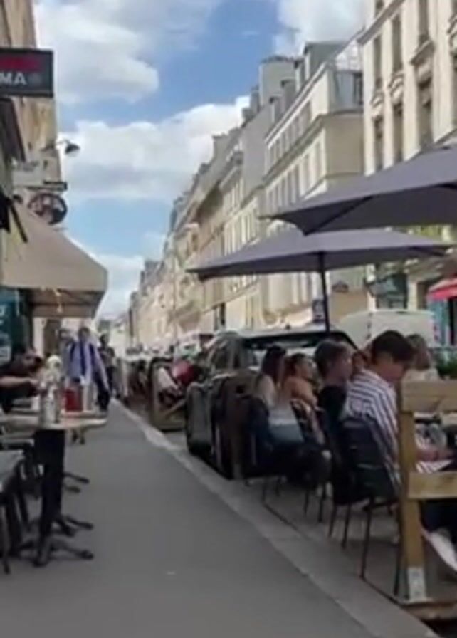 The camera moves along a sidewalk in a European city, where the street is lined with buildings. On one side of the street, there's a restaurant with outdoor seating, covered by umbrellas. People are seated at the tables, eating and talking. On the other side of the sidewalk, there's another restaurant with tables and chairs. People walk along the sidewalk. The sky is blue with white clouds.