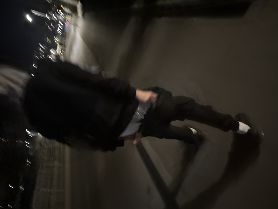 The image depicts a nighttime urban scene in Varna, Bulgaria, characterized by significant motion blur. A single individual, appearing to be male, is captured from behind, positioned towards the center-left of the frame and in motion. The subject is wearing a dark, possibly black, hooded top or sweatshirt over a visible white undershirt. Black pants, which appear to be sagging slightly to reveal the white undershirt or underwear above the waistline, are worn. White socks are visible above dark footwear, possibly sneakers. The individual's right hand is engaged with their pants, appearing to reach into a pocket or adjust the garment. The ground surface is dark and appears paved, consistent with an asphalt road or walkway. A distinct dark "X" shape is present on the paved surface directly behind and to the left of the individual's legs. Artificial illumination from unseen sources casts a shadow of the person towards the lower-left. In the background, on the left side, a blurred, dark structure with vertical elements resembling a railing or barrier is visible. On the right side of the background, multiple blurred points of light, indicative of distant streetlights or vehicle lights, create a bokeh effect. A taller, vertical blurred light source on the far right suggests a streetlight. The overall lighting is dim, consistent with nighttime conditions in an urban area. Due to the blur and lack of distinctive landmarks, the precise location within Varna cannot be further specified beyond an urban street or promenade featuring a prominent railing.
