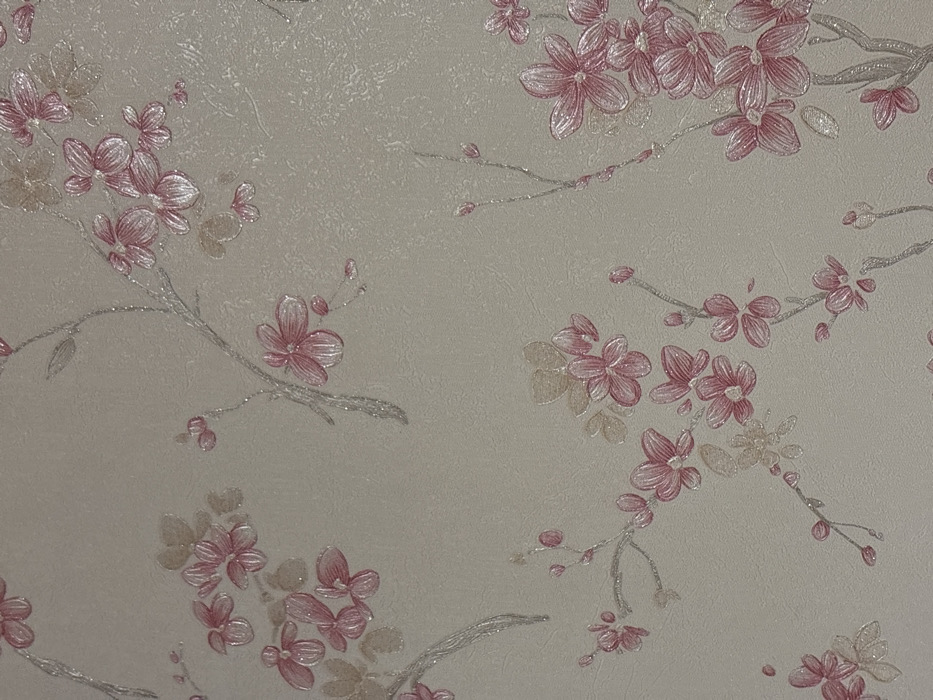 A static close-up image displays a section of patterned wallpaper, located on a wall in the city of Munin, Syria. The background is a light beige with a subtle, irregular textured finish. The pattern depicts intertwined floral branches in a silver-grey color with a shimmering, possibly glittered finish. Attached to these branches are numerous five-petaled flowers, primarily pink, with some in a pale gold or beige color. The flowers are embossed, presenting a three-dimensional effect and a reflective surface. No individuals, additional objects, or discernible actions are depicted within the frame.