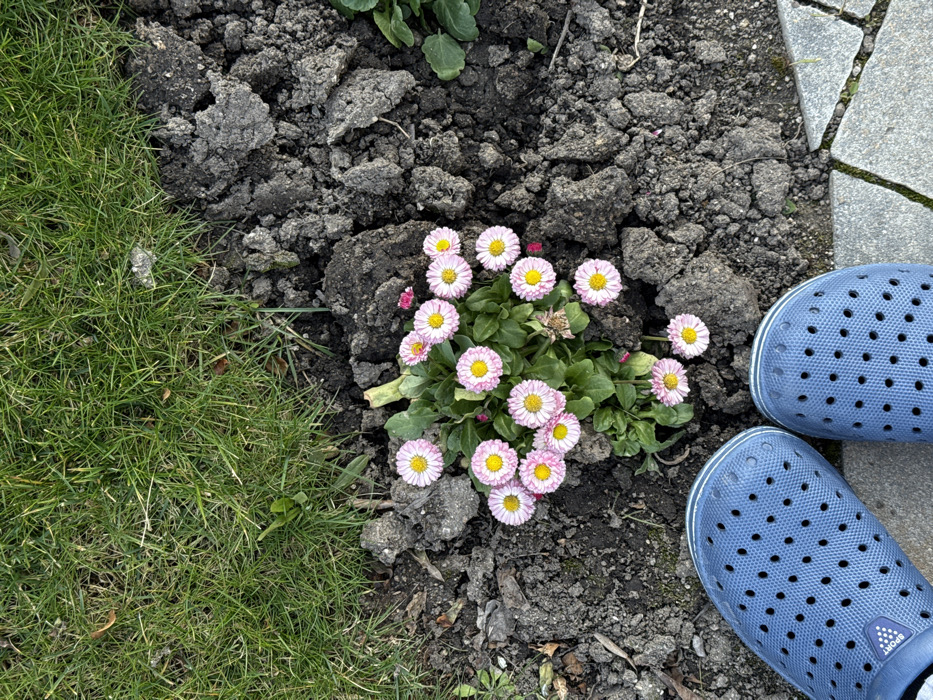 An overhead photograph captures a ground-level scene in Trud, Bulgaria. In the foreground, a pair of human feet are visible, clad in blue, perforated clogs with "SPORT" embossed on the left shoe. The clogs rest on a grey, irregularly shaped paving stone. Directly ahead of the clogs, a dense cluster of approximately 15 to 20 small flowering plants with pink and white petals and yellow centers emerges from dark, clumpy soil. The soil occupies the mid-ground and extends to the right. In the upper portion of the image, a patch of green, slightly untrimmed grass is visible, bordering the dark soil. The scene indicates an outdoor garden or cultivated area.