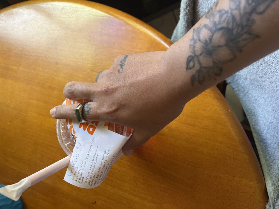 - "A close-up, high-angle shot captures a person's left hand holding a plastic beverage cup from Dunkin' on a polished, light brown wooden table" by FM-Z0s923, licensed under CC BY 4.0