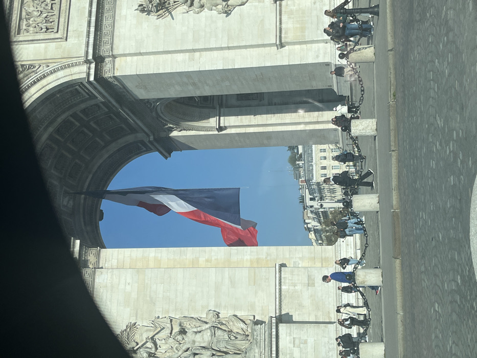 The image displays a daytime scene featuring the Arc de Triomphe, located in Paris, France. A large French tricolor flag, vertically striped blue, white, and red, hangs from the center of the Arc's main archway, partially unfurled in a gentle breeze. The monumental limestone structure exhibits classical architectural details, including a prominent sculptural relief on the lower left pillar. Approximately two dozen pedestrians are present on the cobblestone pavement in front of the monument, walking individually or in small groups. They are dressed in various casual attire. A barrier composed of light-colored stone bollards connected by heavy dark metal chains delineates the pedestrian zone. Beyond the Arc and to the left, several multi-story buildings with light-colored facades and traditional Parisian architecture are visible under a clear, bright blue sky. The foreground suggests the perspective is from a vehicle, with a dark, angled obstruction (likely a car interior element) in the upper left corner.