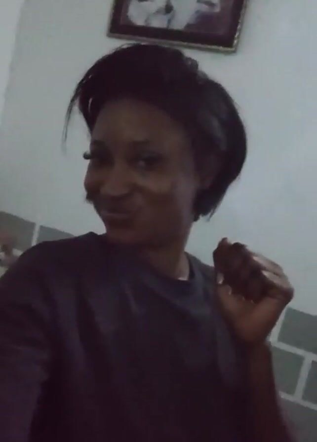 A woman with dark hair pulled back poses for a selfie video. She wears a dark gray shirt and smiles, looking at the camera. In the background, there's a picture frame hanging on the wall, a plant, and a brick-like design feature on the wall. She touches her face with her hand at one point. She speaks briefly in the video. The lighting appears somewhat dim.