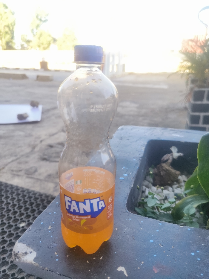 This image displays an outdoor scene located in Jos, Nigeria. The primary subject is a clear plastic Fanta Orange Flavoured Drink bottle, approximately half-full with an orange liquid, positioned on a dark, weathered concrete surface. The bottle is capped with blue plastic and exhibits condensation droplets on its upper, empty section. The Fanta label, prominently featuring "orange flavoured drink," is visible on the lower portion of the bottle. The concrete surface beneath the bottle shows sporadic light blue paint splatters. To the left of the bottle, a section of a dark, perforated grate is visible. To the right, the concrete forms the edge of a rectangular planter filled with small white pebbles, sporadic green foliage, and a small, light-colored decorative object resembling a rock. The background consists of a bright, light-colored ground surface. On the left, a piece of white paper or cardboard holds a few dark, irregular objects. On the right, a dark, block-patterned planter containing a leafy plant is partially visible. The scene is brightly illuminated by natural light, indicative of an outdoor daytime setting. There are no individuals or discernible actions present in the frame.