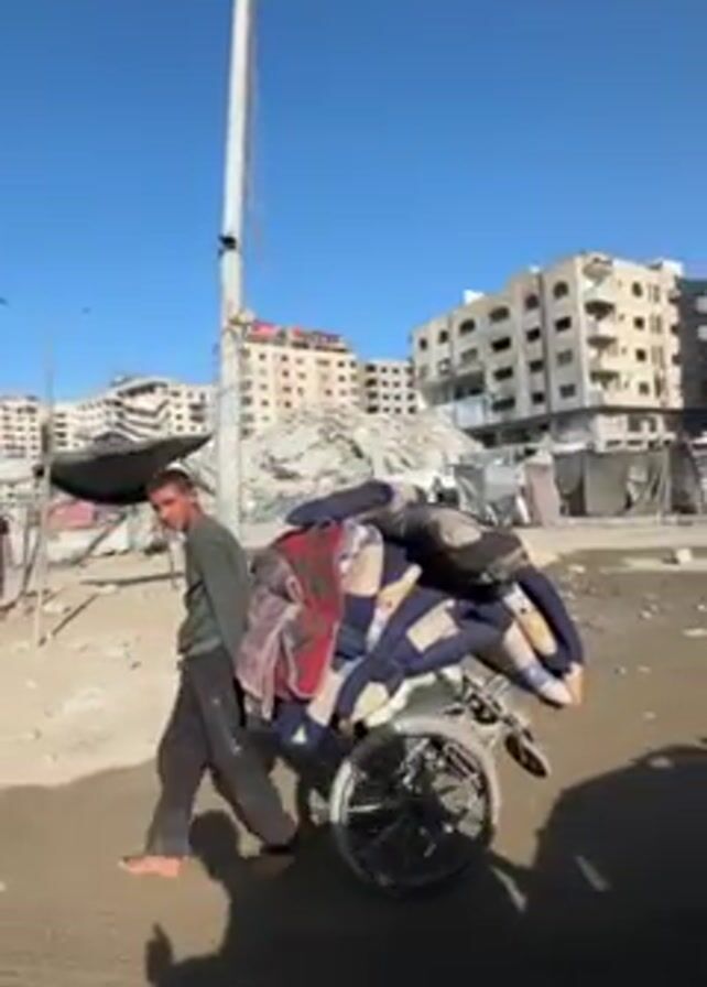 young man pushing a two-wheeled cart piled with blankets through a devastated urban landscape. Buildings are heavily damaged and there is rubble everywhere. Other people are also present in the background, some carrying items. The weather is sunny. The camera is moving, appearing to be within a vehicle.