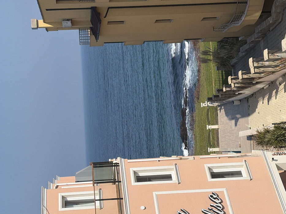 The image depicts an elevated view of a coastal scene in the city of Ahtopol, Bulgaria. Two multi-story buildings flank a central view of the Black Sea under a clear blue sky. On the left, a peach-colored building features multiple windows with white frames and white ornamental trim. A balcony on an upper floor has a black metal railing with a clear glass panel and a wooden handrail. Part of white lettering, appearing to spell "Paradiso," is visible on its side. On the right, a yellow-ochre colored building has several narrow windows with white frames. An air conditioning unit is mounted on its exterior, and a small balcony with a metal railing extends from an upper level. A chimney stack is visible at the top. Between the two buildings, the blue-green waters of the sea extend to the horizon. Waves are visible breaking against a rocky shoreline. A strip of green grass lies between the water's edge and a paved area. At ground level, a courtyard area with light-colored paving tiles leads to a black wrought iron gate and fence, which separates it from the grassy area near the sea. To the right of this paved area, a cobblestone-patterned path descends alongside a retaining wall topped with square posts. Tall, light-colored ornamental grasses are situated near the right building's fence, and a small palm-like plant is visible at the base of the left building. No individuals are present in the scene.