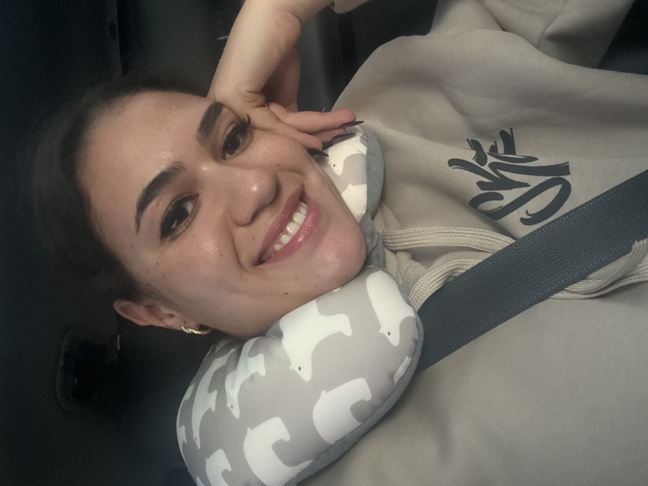 A smiling woman with dark hair and bright eyes rests her head on a gray neck pillow adorned with white polar bear images. She wears gold hoop earrings and a beige hoodie with a dark graphic design. A gray seatbelt crosses her body. The background appears to be the interior of a car. She poses with her hand gently touching her cheek.